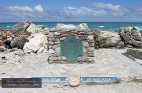 Für alle die noch immer auf den südlichsten Punkt Afrikas warten: Heute fahren wir hin! Das Cape Agulhas hat seinen Namen von den portugiesischen Seefahrern, die hier feststellten, das ihre Kompassnadeln (agulhas = Nadeln) keine Kursabweichungen mehr in nördliche Richtung anzeigten. Es gibt einen Leuchtturm und einen Markierungsstein, der einen darauf hinweist, dass sich auf der linken Seite der Indische und auf der rechten Seite der Atlantische Ozean befindet. Ansonsten ist der Ort nicht besonders spektakulär.