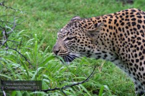 Durch den Regen anscheinend völlig entspannt schleicht das Tier relativ nah um unseren Wagen. Selbst unser Ranger ist ganz aufgeregt. In den Jahren, die er den Job hier macht, hat er noch nie einen Leoparden so nah gesehen. Kann man soo viel Glück haben? Wir sind das einzige Auto und haben so Zeit, das elegante Muskelpaket eine Weile zu beobachten. Schließlich verschwindet der Leopard dann doch hinter Bäumen hinunter in einen Flusslauf und damit aus unserem Sichtfeld.