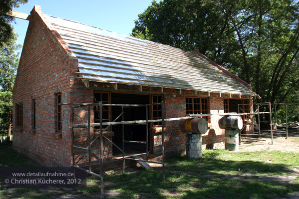 Zwischen Rinderzucht und Tourismus hatte man auf Reed Valley auch mal versucht, die Haushaltskasse mit der Zucht von Krokodilen aufzubessern. Als ich vor 5 Jahren hier war, war die Krokodil-Farm noch voll intakt. Mittlerweile ist sie aufgegeben. Vor allem wohl, weil man der Meinung war, dass sie nicht zum Konzept der Renaturierung passte, die Amakhala vertritt. Aber ein paar Krokodile sind noch übrig und die schauen wir uns an. Ein ziemlicher Brocken tut das, was Krokodile eben so machen: Er liegt faul rum. Christian hat heute wohl seinen mutigen Tag. Auf jeden Fall stochert er mit einem Stock in Richtung des Faulpelzes. Uuiuiuui – kann das Vieh schnell werden! Zum Glück sind wir sicher durch ein Mäuerchen voneinander getrennt. Ich glaube, wir haben die Lektion gelernt. Mit Krokodilen ist nicht zu spaßen!